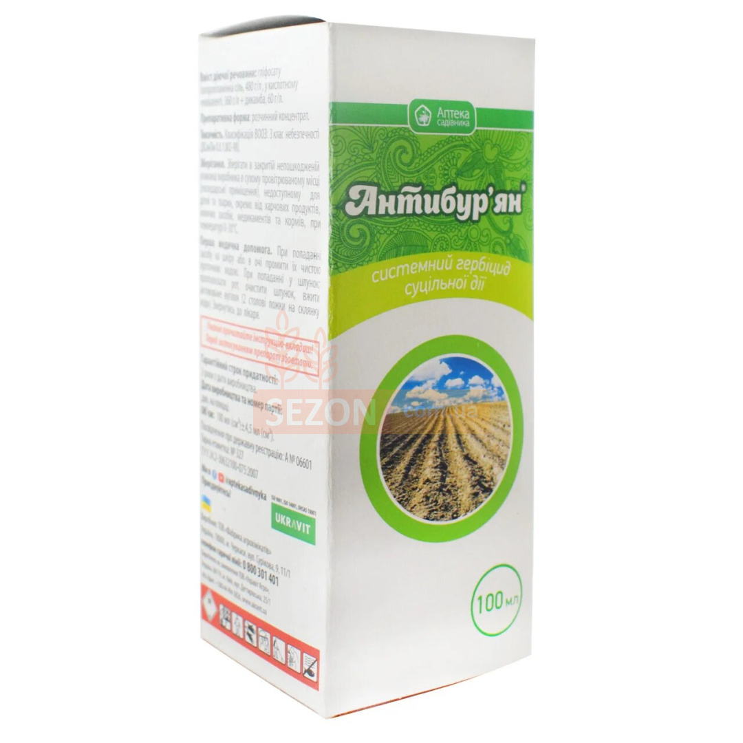 Антибурьян — это гербицид системного действия, предназначенный для уничтожения более 300 видов однолетних и многолетних сорняков, включая карантинные и кустарниковую растительность. Применяется на парах, послеуборочных и несельскохозяйственных землях, виноградниках, в садах и при подготовке лесных участков под посадку.