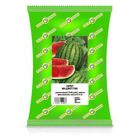 Семена арбуз сорт Маджестик - сильнорослый сорт, с хорошим укрытием плодов. Сорт раннего срока созревания. Окраска кожуры светло-зеленая с широкими темно-зелеными полосами. Мякоть превосходной темно-красной окраски. Отличается превосходной завязываемостью плодов и высокой урожайностью. Плоды округло-овальной формы, массой 10-16 кг. Имеют отличную внутреннюю структуру, хрустящую мякоть и превосходный вкус. Рекомендуется для получения ранней продукции, в основном рассадным способом, включая выращивание с использованием временных пленочных укрытий.