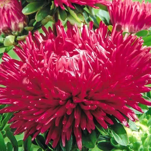 Астра китайская Дрэгон (Callistephus chinensis Dragon). Декоративная и элегантная серия с чрезвычайными соцветиями коготковой формы. Диаметр цветка достигает 10-12 см. Высота растения 65-75 см. Куст пирамидальной формы, разветвленный у основания. Цветоносы длинные и прочные, прекрасно хранятся и транспортируются. На рассаду семена высевают в марте - апреле. Пикировку проводят в фазе 2-3 настоящих листочков по схеме 5x5. В открытый грунт растения высаживают в середине мая. При безрассадном способе семена высевают на постоянное место ранней весной или под зиму. Неприхотливая культура, хорошо реагирует на подкормки. Используется для озеленения приусадебных участков и высококачественного среза. Долгое время цветы сохраняют декоративность в вазе.