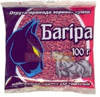 Багира - родентицид для борьбы с крысами. Готовая к применению приманка в виде отравленного зерна. Действующее вещество: бромадиолон 0,005%, способствует нарушению свертывания крови, грызуны гибнут через 3-5 суток после употребления приманки Багира.