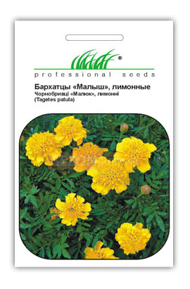Бархатцы Малыш лимонные - однолетнее, карликовое растение. Высота куста 15 см. Бутоны махровые, желтого цвета. Выращивают методом высевания в открытый грунт. Цветут с июня по сентябрь. Бархатцы засухоустойчивы.