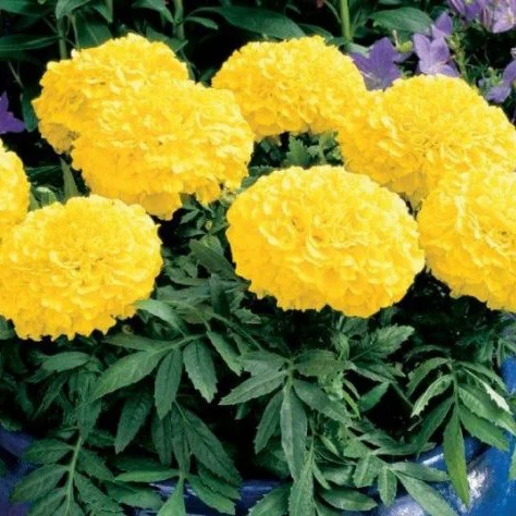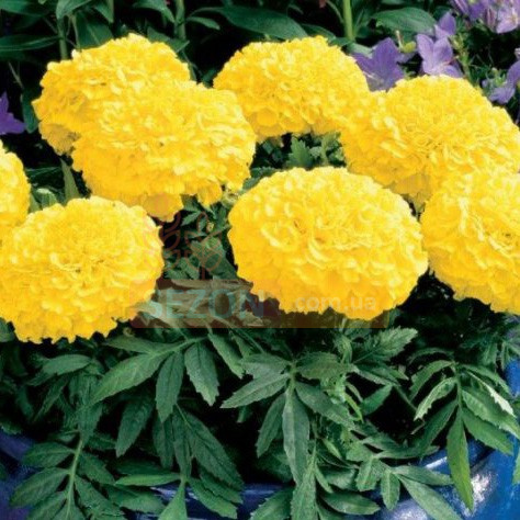 Бархатцы прямостоячие Тайшан ( Tagetes erecta Taishan ) Очень красивая крупноцветковая серия, превосходных, низкорослых бархатцев. Куст компактный, до 30 см в высоту,с большими махровыми соцветиями , до 10 см в диаметре, с превосходным золотистым окрасом. Листочки перисто-рассеченные, зеленого цвета. Имеет мочковатую корневую систему. Характеризуются ранним и довольно продолжительным цветением. Бархатцы, неприхотливое, засухоустойчивое и светолюбивое растение.