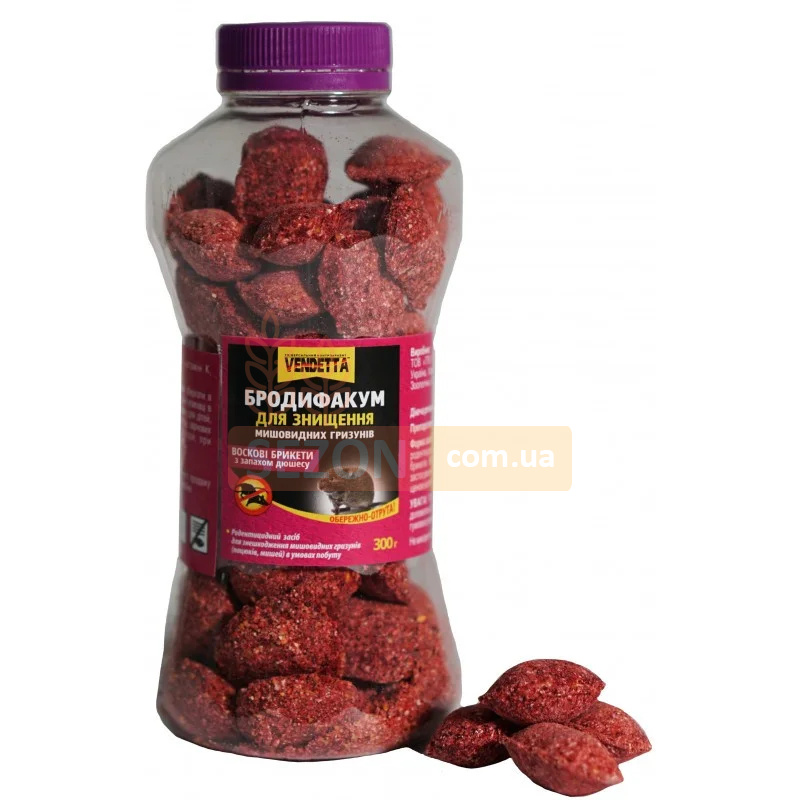 Препарат "Бродифакум восковой брикет от крыс и мышей 300 г, Vendetta" является эффективным родентицидом, разработанным специально для уничтожения крыс и мышей. Препарат представляет собой восковые брикеты, которые легко применять на объектах различных категорий и в условиях быта. Бродифакум действует как антикоагулянт, нарушая образование витамина К1, отвечающего за образование белков протромбинового комплекса. Благодаря этому, уже через несколько дней после употребления приманки, грызуны начинают испытывать кровотечения, как внутренние, так и наружные, что в итоге приводит к их гибели через несколько суток.
