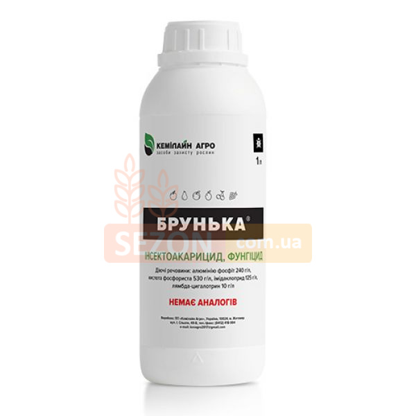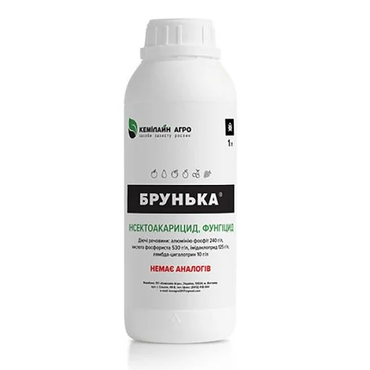 Инструкция, способ применения, состав, дозировка и норма расхода препарата широкого спектра действия Брунька 1 лДействующее вещество: фосфит алюминия 240 г/л, фосфористая кислота 530 г/л, имидаклоприд 125 г/л, лямбда-цигалотрин 10 г/л.