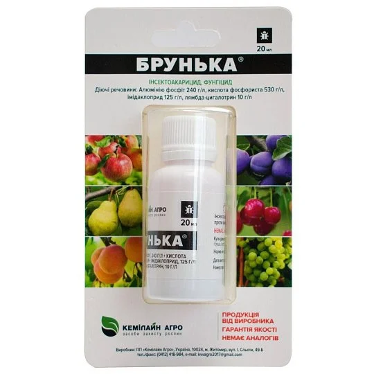 Инструкция, способ применения, состав, дозировка и норма расхода препарата широкого спектра действия Брунька 1 лДействующее вещество: фосфит алюминия 240 г/л, фосфористая кислота 530 г/л, имидаклоприд 125 г/л, лямбда-цигалотрин 10 г/л.