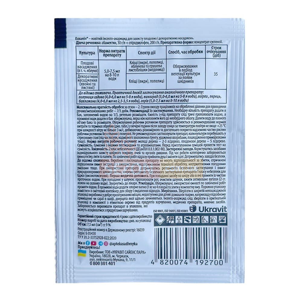 Эскалип — это системный инсектицид и акарицид, предназначенный для уничтожения сосущих насекомых и растительноядных клещей на садовых, хвойных и декоративных культурах. Уникальная формула препарата основана на синергетическом действии двух активных веществ: абамектина и спиродиклофена. Эти компоненты обеспечивают комплексный контроль над вредителями на всех стадиях их развития — от яйца до взрослой особи.