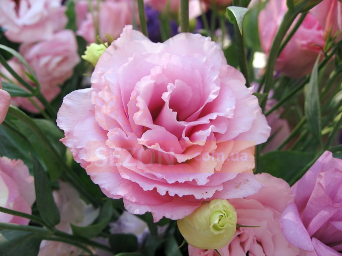 Эустома (Eustoma grandiflorum) АВС F1 - однолетнее крупноцветковое растение. Высота растения 90-110 см. Цветки махровые, розового цвета, похожи на бутоны роз. Цветет обильно и продолжительно. Растение солнцелюбивое, предпочитает окультуренные почвы, требует регулярного полива и опрыскивания. Отлично подходит для среза. Цветет с июля по август.