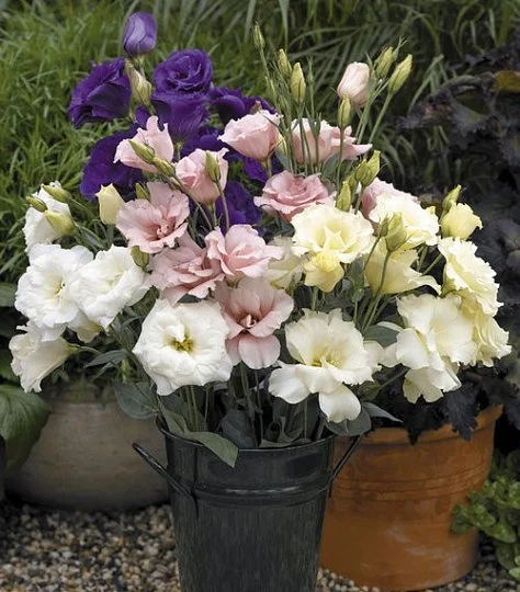 Эустома крупноцветковая махровая F1 (Eustoma grandiflorum F1). Серия с очень крупными махровыми цветами, напоминают полураскрыты бутоны розы. Цветение обильное и продолжительное. Имеет несколько преимуществ: очень длинные и крепкий стебель, длина 50-70 см, большой выбор цветовой гаммы, замечательная форма цветка. Солнцелюбивое растение, предпочитает места с окультуренные грунтом. Нуждается в регулярных поливов и опрыскиваний. Период цветения длится с июля по август. Посев проводят в конце февраля-марте. Семена мелкие, его присыпают, оставляя на поверхности субстрата. Увлажняют из распылителя и накрывают стеклом. Лестницы эустомы появляются через 10-12 дней при температуре 21-24 ° С. Пикировку проводят в фазе 2-3 настоящих листочков в отдельные горшки. На постоянное место высаживают, когда минует угроза заморозков.