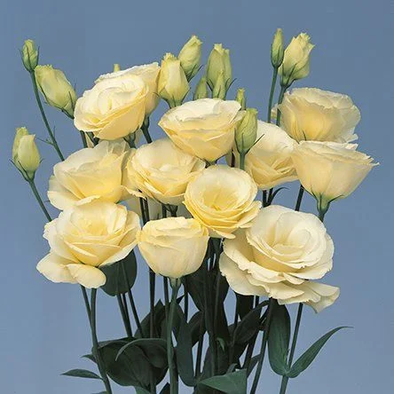Эустома крупноцветковая махровая F1 (Eustoma grandiflorum F1). Серия с очень крупными махровыми цветами, напоминают полураскрыты бутоны розы. Цветение обильное и продолжительное. Имеет несколько преимуществ: очень длинные и крепкий стебель, длина 50-70 см, большой выбор цветовой гаммы, замечательная форма цветка. Солнцелюбивое растение, предпочитает места с окультуренные грунтом. Нуждается в регулярных поливов и опрыскиваний. Период цветения длится с июля по август. Посев проводят в конце февраля-марте. Семена мелкие, его присыпают, оставляя на поверхности субстрата. Увлажняют из распылителя и накрывают стеклом. Лестницы эустомы появляются через 10-12 дней при температуре 21-24 ° С. Пикировку проводят в фазе 2-3 настоящих листочков в отдельные горшки. На постоянное место высаживают, когда минует угроза заморозков.