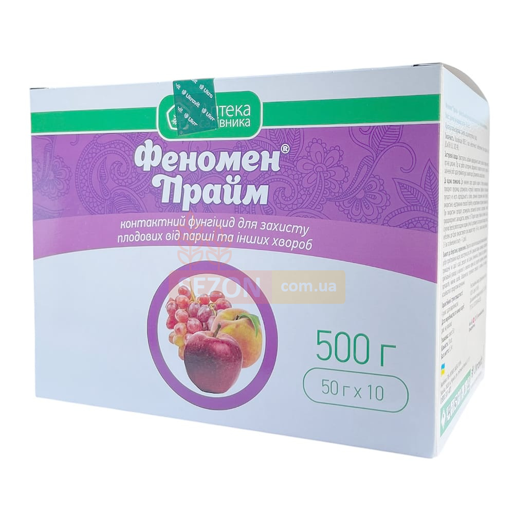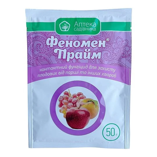 Феномен Прайм — это профилактический фунгицид контактного действия, предназначенный для защиты плодовых деревьев от комплекса грибковых болезней. Активное вещество препарата — каптан (480 г/кг) из химической группы фталимидов. Препарат фиксируется на поверхности растения и не проникает в ткани, что делает его безопасным и эффективным средством именно для профилактических обработок.
