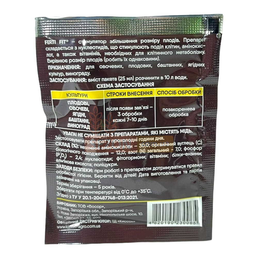 Применение: Для получения оптимальных результатов, содержимое пакета (25 мл) следует растворить в 10 литрах воды и проводить внекорневые обработки каждые 7-10 дней после появления завязи. Рекомендуется всего 3 обработки за сезон.