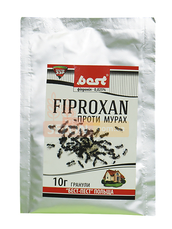 «Фипроксан» — инсектицидное средство в форме гранул для борьбы с муравьями на приусадебных участках, в фундаментах домов, в жилых помещениях. Одной упаковки хватает для 1 кв.м. поверхности скопления или передвижения этих насекомых. «Фипроксан» может использоваться как в сухом, так и в растворенном виде. В жилых помещениях гранулы можно насыпать на блюдце, на приусадебных участках опрыскать муравейник и почву около него. В основу инсектицида входят 2 активных компонента — фипронил и пирипроксифен. Фипронил блокирует прохождение нервного импульса через хлорионные каналы в мембранах нейронов, что приводит к сильному перевозбуждению нервной системы. Гибель из-за этого наблюдается через сутки после применения. Пирипроксифен действует также и на личинки, он подавляет эмбриогенез и процесс метоморфозы. Защитный эффект сохраняется еще 2 недели после использования. Для домашних животных средство не опасно.
