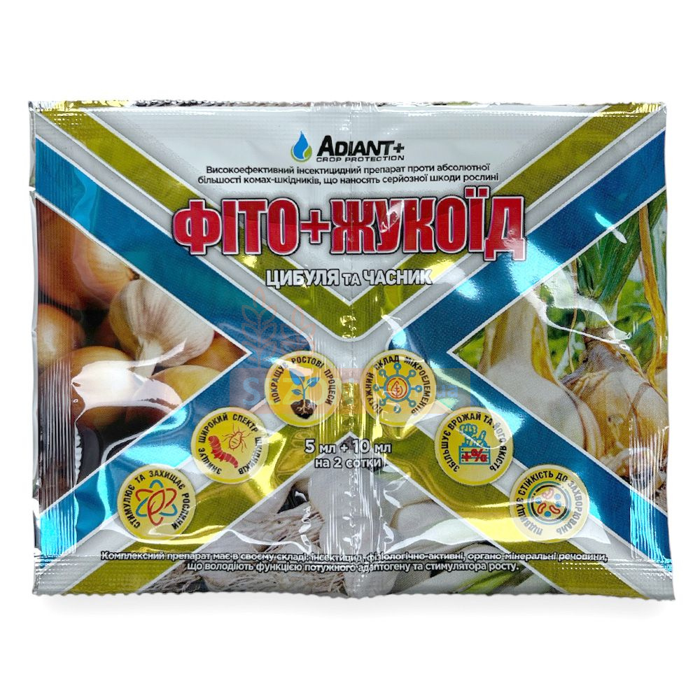 "Инновационный препарат 'Фито плюс Жукоед' от Adiant+ Украина предназначен для защиты лука и чеснока. Этот инсектицид обеспечивает комплексную защиту этих культур от широкого ассортимента вредителей, включая тлю, трипсов, луковую муху, луковую моль, долгоносиков, луковую журчалку, совок и листогрызущих гусениц. В его состав входят имидаклоприд и лямбда-цилаготрин, обеспечивающие контактно-системное действие, а также органо-минеральные компоненты (гуминовые кислоты, фульвокислоты, аминокислоты, витамины и др.), которые служат мощными адаптогенами и стимулируют рост. Действие инсектицида 'Жукоед' блокирует нервные импульсы у вредителей, вызывая их паралич и гибель. Эффект от препарата заметен в течение нескольких дней после обработки и сохраняется до трех недель.