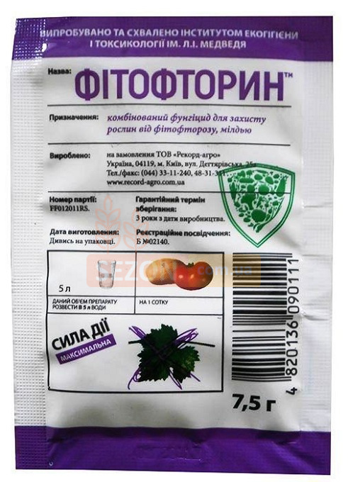 Фитофторин - комбинированный фунгицид для защиты овощных культур от фитофтороза, ложной мучнистой росы, альтернариоза и других заболеваний. Обладает лечебным и профилактическим действием. Регламент применения: томаты, картофель, виноград. Препарат отлично переносится растениями, но при этом губительно влияет на грибковые заболевания. Период ожидания: для томатов - 14 дней, для картофеля - 20 дней, для винограда - 30 дней.