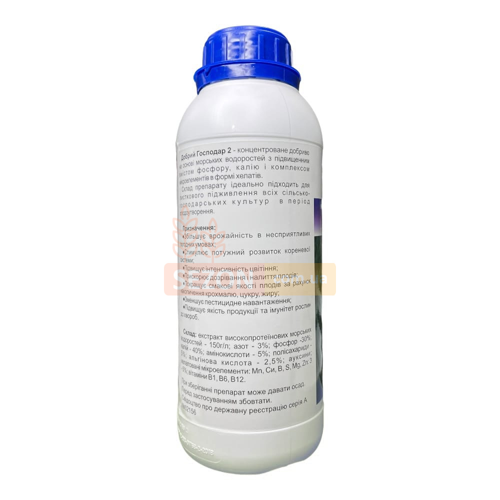 Высококонцентрированное органо-минеральное добавление на основе морских морей. Универсальное средство для внекорневой подкормки с/х культурами, обогащенными фосфором и калием, инсекто-фунгицидными и бактерицидными методами.