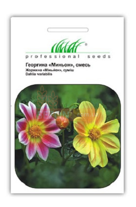 Георгина Миньон (Dahlia variabilis Mignon mixed) - смесь низкорослых сортов немахровых цветов, ярких расцветок. Растения высотой 40-50 см используются для оформления бордюров, рабаток и клумб. Цветение длится с июля до заморозков.