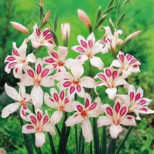 Карликовый гладиолус Принц Клаус создан для украшения клумб, альпинариев, рокариев и вазонов. Его отличает необычный окрас и ассиметричная структура. На белых лепестках красуется шикарный розовый глаз со светлой полосой посередине и темной каймой. Из этого сорта можно создать шикарные букеты. В срезке цветы стоят долго, сохраняя свежесть по 10-14 дней.