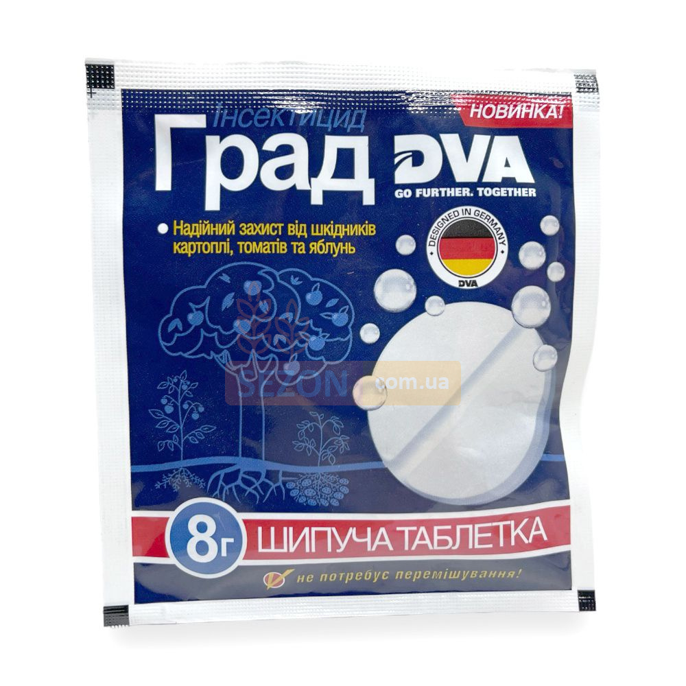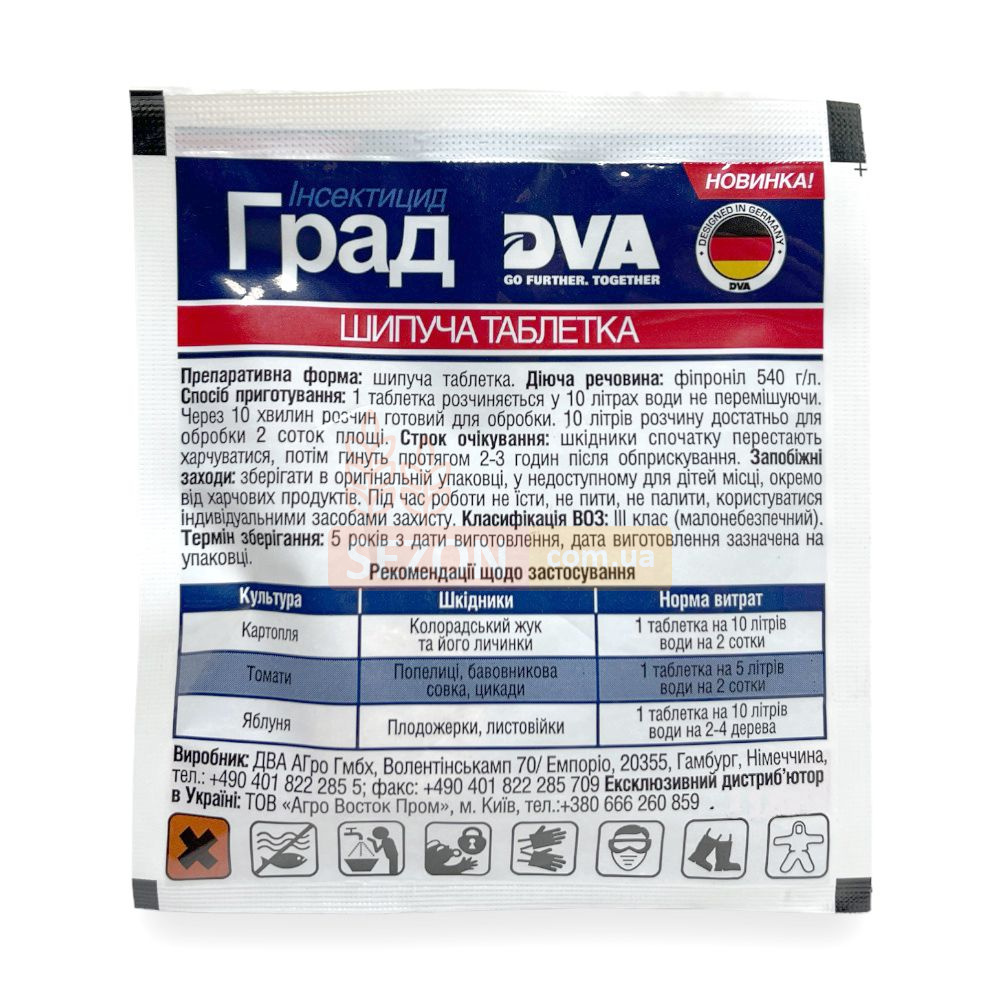 Таблетка инсектицида "Град DVA", произведенная в Германии, используется как контактное и кишечное средство защиты картофеля, яблонь и томатов от разнообразных вредителей, включая колорадского жука, его личинок, тли, совок, трипсов, белокрылок и других. Ключевым компонентом этого препарата является фипронил, который обладает высокой токсичностью для взрослых насекомых, гусениц, личинок и яиц паразитов. При опрыскивании, фипронил входит в организм вредителей и блокирует передачу нервных импульсов, нарушая таким образом жизненно важные функции их нервной системы и двигательных центров. В результате вредители прекращают питание и умирают в течение 2-3 часов после обработки. Если соблюдаются рекомендуемые нормы расхода, препарат не вызывает фитотоксичности.