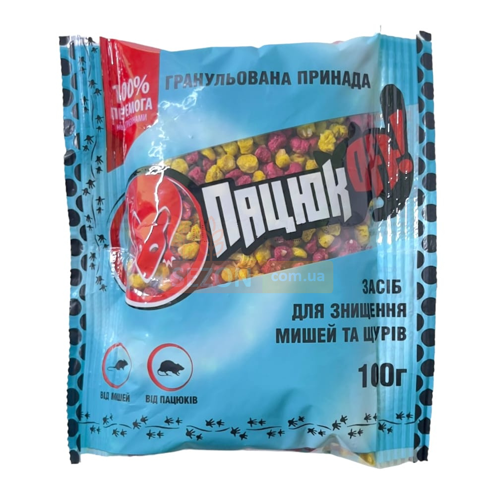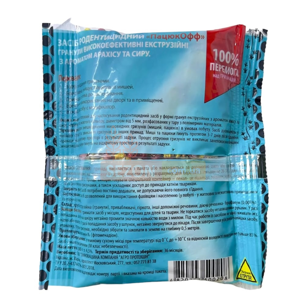 Родентицидная приманка в виде экструзионных протравленных гранул с ароматической добавкой арахиса и сыра Пацюк OFF применяется для выведения крыс и мышей в различных закрытых жилых и нежилых помещениях. Основное действующее вещество - токсин бродифакум, являющийся мощным родентицидом, вызывающим 100% смертность грызунов после поедания приманки в течение 3-7 дней. Благодаря тому, что гибель вредителей наступает не сразу, у сородичей не возникает опасений в поедании протравленной приманки. Грызуны покидают свои убежища и погибают на открытом пространстве в результате токсического удушья. Действующее вещество проявляет высокую токсичность при разовом поедании приманки. Поэтому в состав препарата дополнительно включено специальное горькое вещество для избегания поедания приманки нецелевыми животными. Также в состав отравленной приманки для мышеподобных грызунов включены ароматические аттрактанты, которые приманивают грызунов, и мумификатор, который не позволяет погибшим вредителям разлагаться и издавать неприятный тлетворный запах.