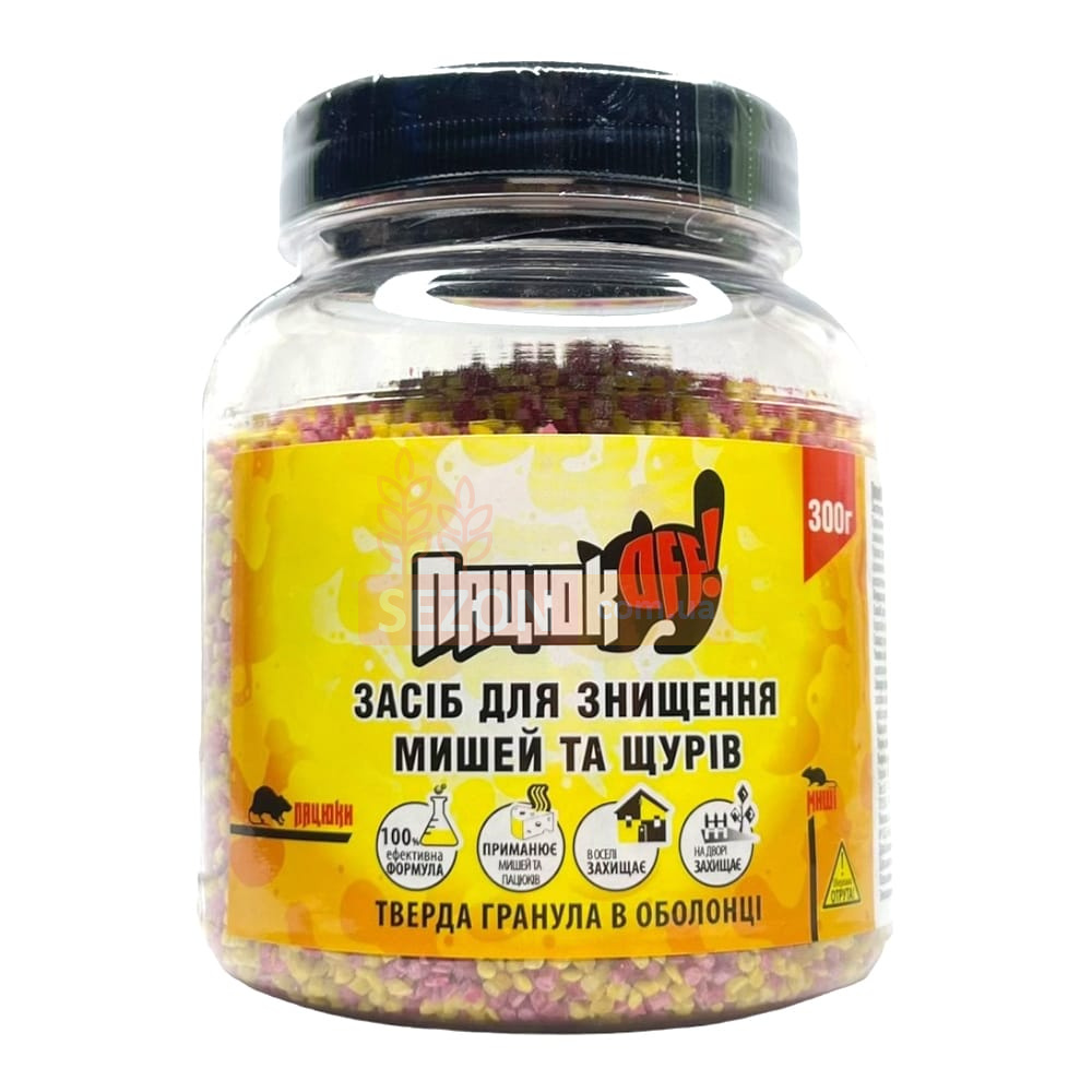 Родентицидная приманка в виде экструзионных протравленных гранул с ароматической добавкой арахиса и сыра Пацюк OFF применяется для выведения крыс и мышей в различных закрытых жилых и нежилых помещениях. Основное действующее вещество - токсин бродифакум, являющийся мощным родентицидом, вызывающим 100% смертность грызунов после поедания приманки в течение 3-7 дней. Благодаря тому, что гибель вредителей наступает не сразу, у сородичей не возникает опасений в поедании протравленной приманки. Грызуны покидают свои убежища и погибают на открытом пространстве в результате токсического удушья. Действующее вещество проявляет высокую токсичность при разовом поедании приманки. Поэтому в состав препарата дополнительно включено специальное горькое вещество для избегания поедания приманки нецелевыми животными. Также в состав отравленной приманки для мышеподобных грызунов включены ароматические аттрактанты, которые приманивают грызунов, и мумификатор, который не позволяет погибшим вредителям разлагаться и издавать неприятный тлетворный запах.