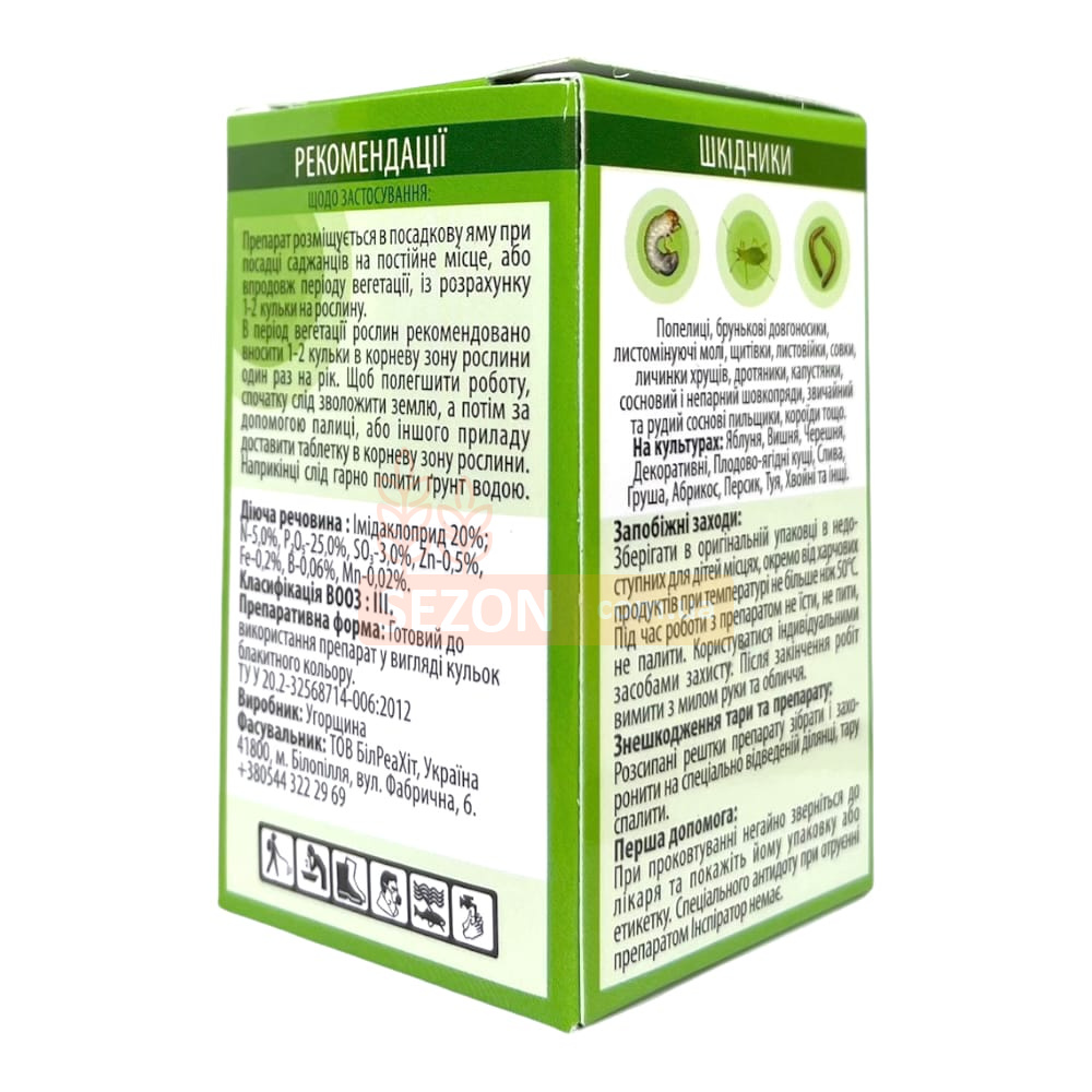 Таблетированная форма удобна в применении: таблетка инсектицида размещается в корневой зоне, где постепенно растворяется, обеспечивая пролонгированную защиту растений от вредителей. Благодаря действующему веществу – имидаклоприду, средство эффективно блокирует нервную систему насекомых, предотвращая их размножение и дальнейшее повреждение культур.