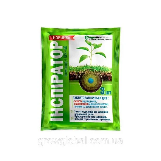 «Инспиратор» — системный инсектицид в форме таблетированных шариков, предназначенный для защиты молодых плодовых, лесных и декоративных культур от вредителей, которые повреждают корни и надземные части. Препарат закладывается в почву точечно и постепенно высвобождает действующее вещество, формируя длительный защитный фон. Дополнительно в составе предусмотрены питательные элементы, поддерживающие укоренение и стартовый рост после посадки.