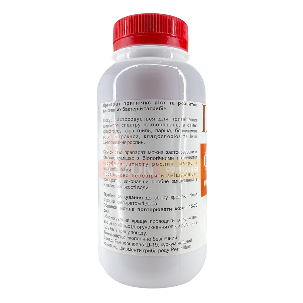 Фунгицид широкого спектра действия Изокур применяется для защиты сельскохозяйственных культур от патогенных бактерий и грибов. В основу препарата входит: Pseudamonas Ш-19, специальный куркуманоидный комплекс, который является эффективным противогрибковым средством и ферменты гриба рода Penicillium. Данные составляющие эффективно подавляют рост и развитие болезней растений, одновременно являются безопасными для людей, животных и окружающей среды. Бактерии Pseudamonas способны к выработке внеклеточных соединений, оказывающих негативное воздействие на развитие возбудителей заболеваний и обладают высокой активностью против гельминтоспориоза, а споры и бактерии гриба-антагониста Penicillium производят природные антибиотики, которые уничтожают развитие патогенных организмов и предотвращают их повторное появление. Обработку растений можно проводить во время всего периода вегетации, с интервалом 15-20 дней. Фунгицид эффективно предоставляет защиту для картофеля, капусты, томатов, перца, кабачков, пшеницы, риса, яблони, груши, сливы, малины, винограда от курчавости листьев, фитофтороза, серой гнили, парши, мучнистой росы, антракноза, кладоспориоза, пятнистости листьев, корневой гнили и других болезней, которые могут повлиять на урожай и внешний вид растения.