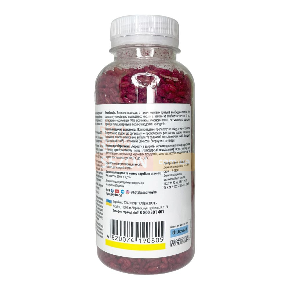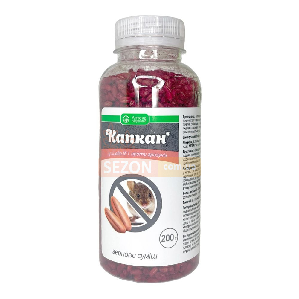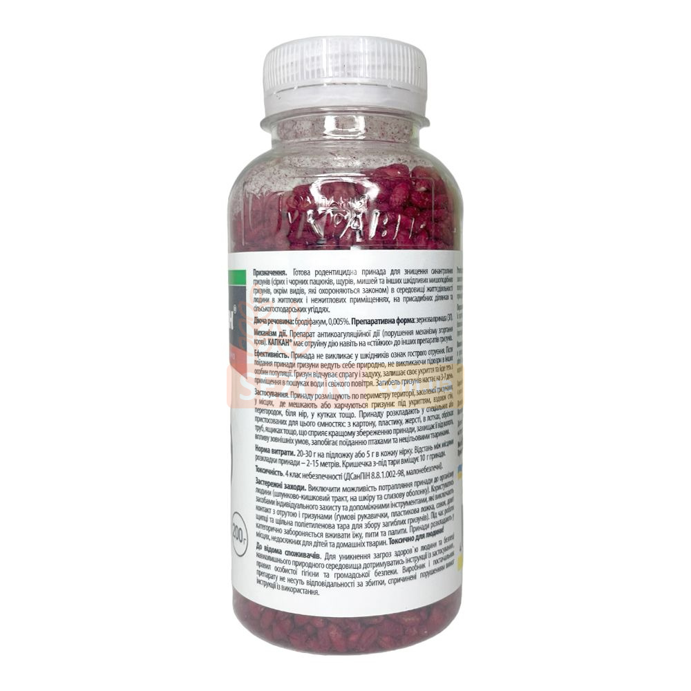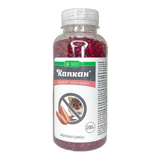 Родентицид "Капкан" от Ukravit - это эффективное зерновое средство против грызунов, произведенное в Украине, готовое к использованию без предварительной обработки. Продукт представляет собой отравленную зерновую композицию, созданную для тотального устранения крыс и мышей в личных подсобных хозяйствах, аграрных областях, а также внутри помещений. "Капкан" содержит бродифакум, синтетическое антикоагулянтное вещество второго поколения, которое мешает синтезу витамина K1, критически важного для формирования протромбиновых белков. В течение одних суток после употребления средства коагуляция крови значительно ухудшается, вредится структура сосудов. Это приводит к тому, что любое внутреннее или наружное травмирование грызунов вызывает внутренние кровопролития и последующую смерть. Полная ликвидация происходит в течение 3-5 дней, преимущественно на открытой местности. Замедленный эффект родентицида не алармит оставшихся грызунов. Препарат сохраняет свою активность даже в условиях высокой влажности и при повышенной температуре.