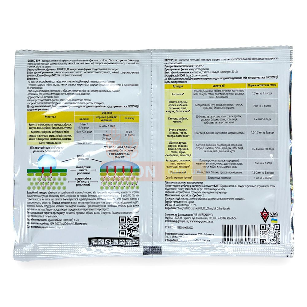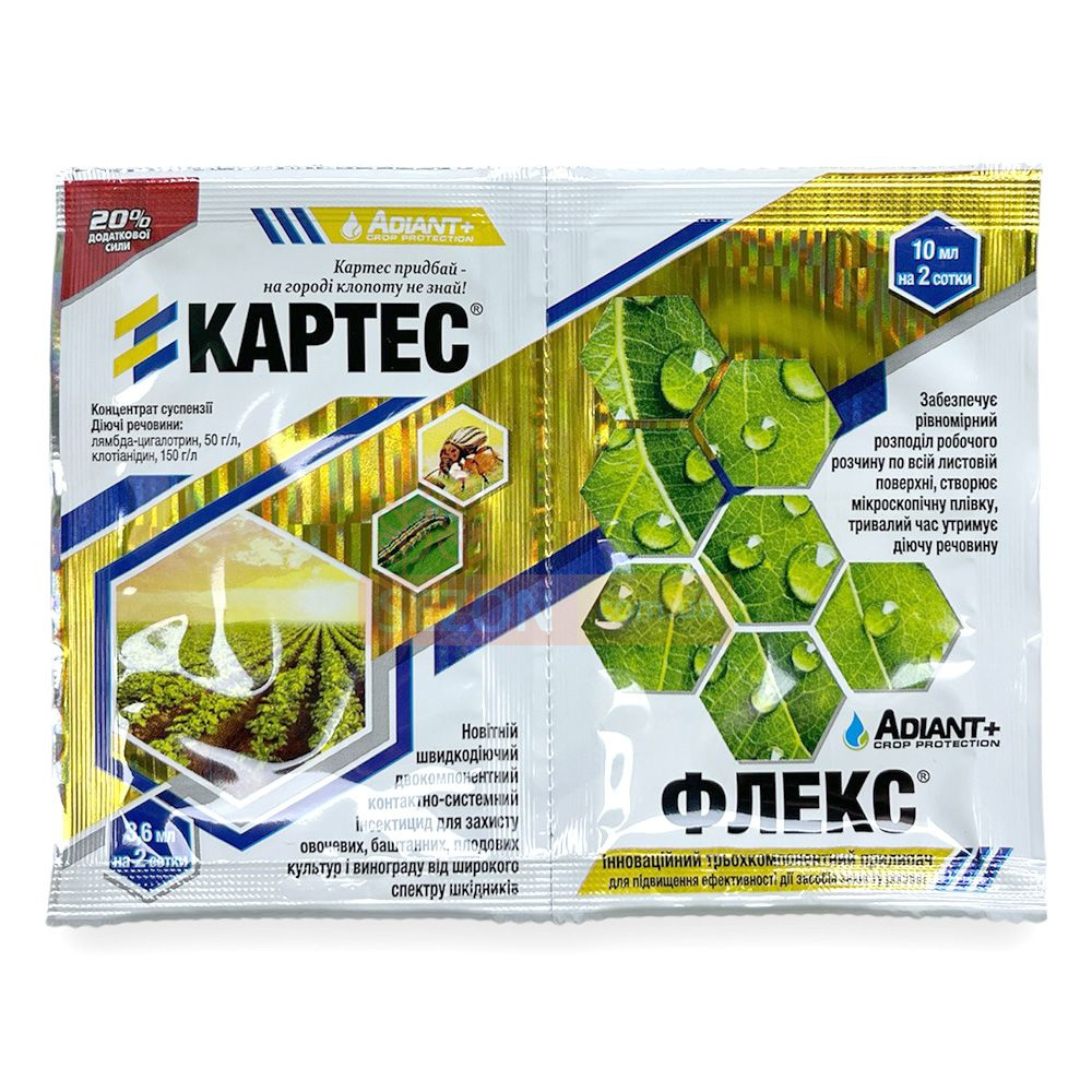 Картес плюс прилипатель Флекс - это современный инсектицид, который быстро и эффективно уничтожает насекомых в овощных, плодово-ягодных и зерновых культурах, включая колорадского жука, белокрылку, тли, трипсов, плодожорку и листовертку.