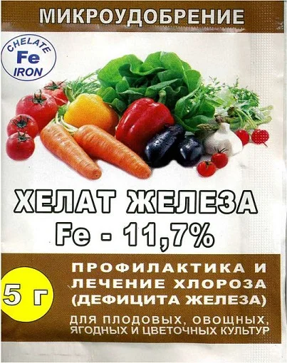 Хелат железа - водорастворимое удобрение для профилактики и лечения дефицита железа (хлороза) у рассады и взрослых растений садово-огородных культур, выращиваемых в теплицах или в открытом грунте. Способ приготовления: 5 г препарата (1 упаковка) растворить в 10л воды. Способ внесения: полив или опрыскивание. Кратность применения: 2 раза в период роста (далее - по необходимости). Регламент применения: плодово-ягодные, овощные культуры.