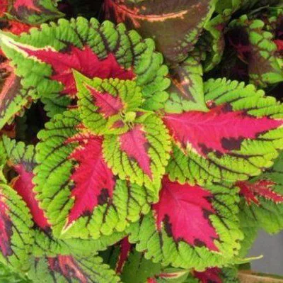 емена цветов Колеуса Конг от селекционной компании Pan American США. Это высокие, хорошо разветвленные растения с крупными листьями уникальной пестрой окраски. Колеусы Конг созданы для ландшафтных посадок, могут использоваться как акцентная группа в вазоне. В полной тени колеусы Конг не теряют своей декоративности. В контейнерных композициях высаживают колеусы Конга по краям. Высота растения 30-35 см.