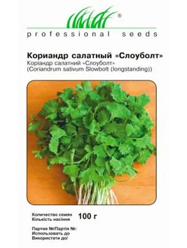 Кориандр Слоуболт — это среднеспелый салатный сорт с периодом вегетации 30–50 дней. Отличается устойчивостью к стрелкованию, что позволяет дольше сохранять зелень пригодной к употреблению. Предназначен для выращивания в открытом грунте на зелень.