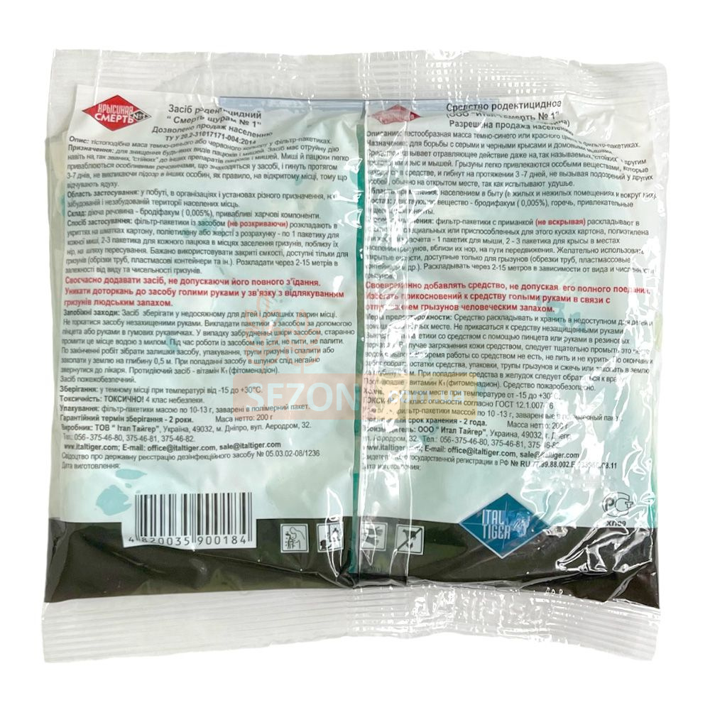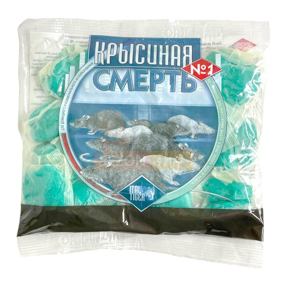 Крысиная смерть - родентицидная паста в виде приманки из теста предназначенная для уничтожения и контроля грызунов в жилых и промышленных помещениях, сельскохозяйственных угодьях и полях, гостиницах и заведениях общественного питания, складах и теплицах, а так же на производствах и фабриках. Средство от грызунов активно работает против серых и черных крыс, сусликов, полевок, а так же обыкновенных домовых мышей.