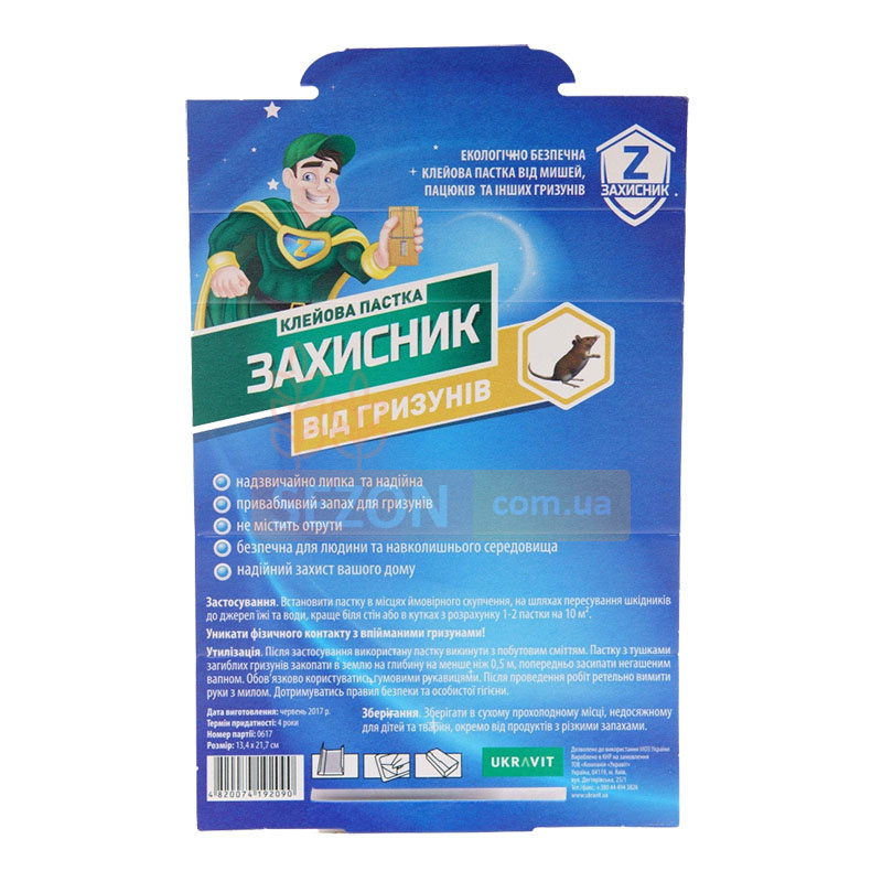Клеевая ловушка «Захисник» предназначена для отлова грызунов в бытовых помещениях и хозяйственных зонах. Она помогает контролировать появление мышей и крыс без применения токсичных веществ. Конструкция основана на прочном основании и слое особо липкого клея, который сохраняет свои свойства длительное время. Ловушка имеет лёгкий запах печенья, что способствует привлечению грызунов и повышает эффективность размещения в местах их активности. Модель подходит для использования в жилых комнатах, кладовых, подвалах, на кухнях и других закрытых пространствах.