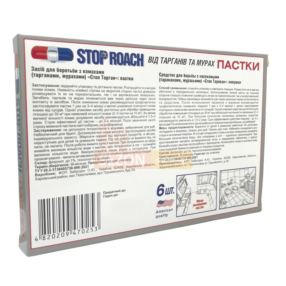Капканы против тараканов Stop Roach, созданные по технологии, которую разработал Университет Корнелл в США, используются для поимки всех типов тараканов, муравьев-ксилофагов, садовых, рыжих, фараонских и других видов муравьев внутри объектов различного типа: жилых, промышленных и медицинских помещений, пищевых складов, амбаров, подвалов, погребов, хранилищ. Капкан работает по следующему принципу: инсектицидный состав, расположенный в середине диска, содержит аттрактант, который манит тараканов и муравьев. Активное вещество, входящее в состав этого продукта - фипронил, - контактно-кишечный инсектицид со слабыми системными свойствами. При попадании в организм насекомого, фипронил нарушает ключевые функции нервной системы, вследствие чего смерть вредителя происходит от паралича в течение нескольких часов. Использование клеящей ленты на обратной стороне капканов позволяет устанавливать их как на горизонтальных, так и на вертикальных поверхностях.