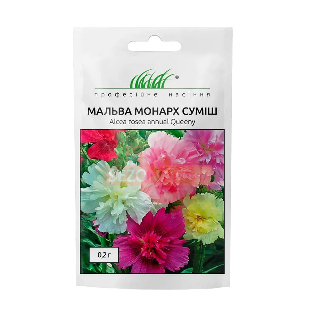 Мальва махровая Монарх (Alcea rosea annual Queeny) — декоративная культура с крупными густомахровыми цветками. Растение относится к многолетним, но в саду чаще выращивается как двулетник или однолетник. Куст формирует прочные стебли, разветвлённые от основания, и достигает 50–60 см. Соцветия кистевидные, цветки до 12 см в диаметре. В упаковке — смесь окрасок, поэтому посадки смотрятся разнообразно.