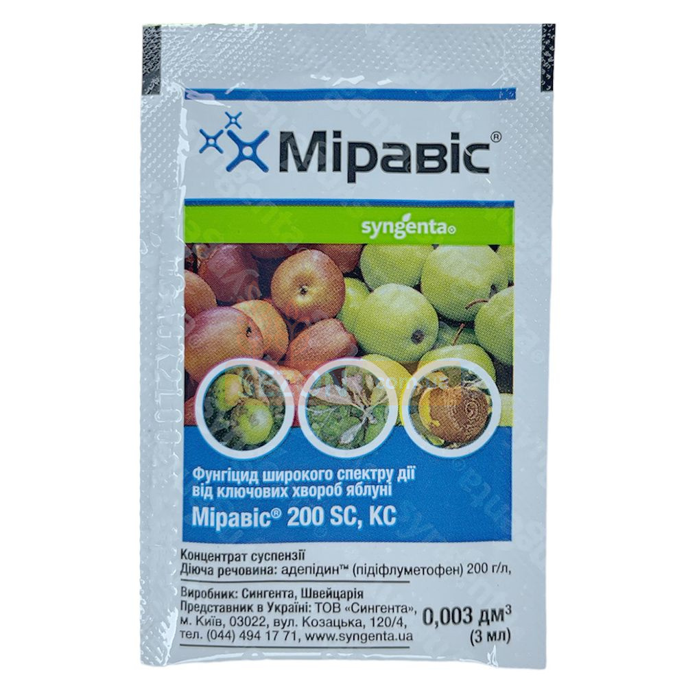 Миравис 200 SC – это контактно-системный фунгицид, предназначенный для защиты яблонь, черешни, персиков, картофеля, томатов, огурцов, капусты, моркови и других культур от комплекса грибковых заболеваний. Препарат эффективно защищает растения от таких заболеваний как парша, мучнистая роса, монилиоз, альтернариоз и других.