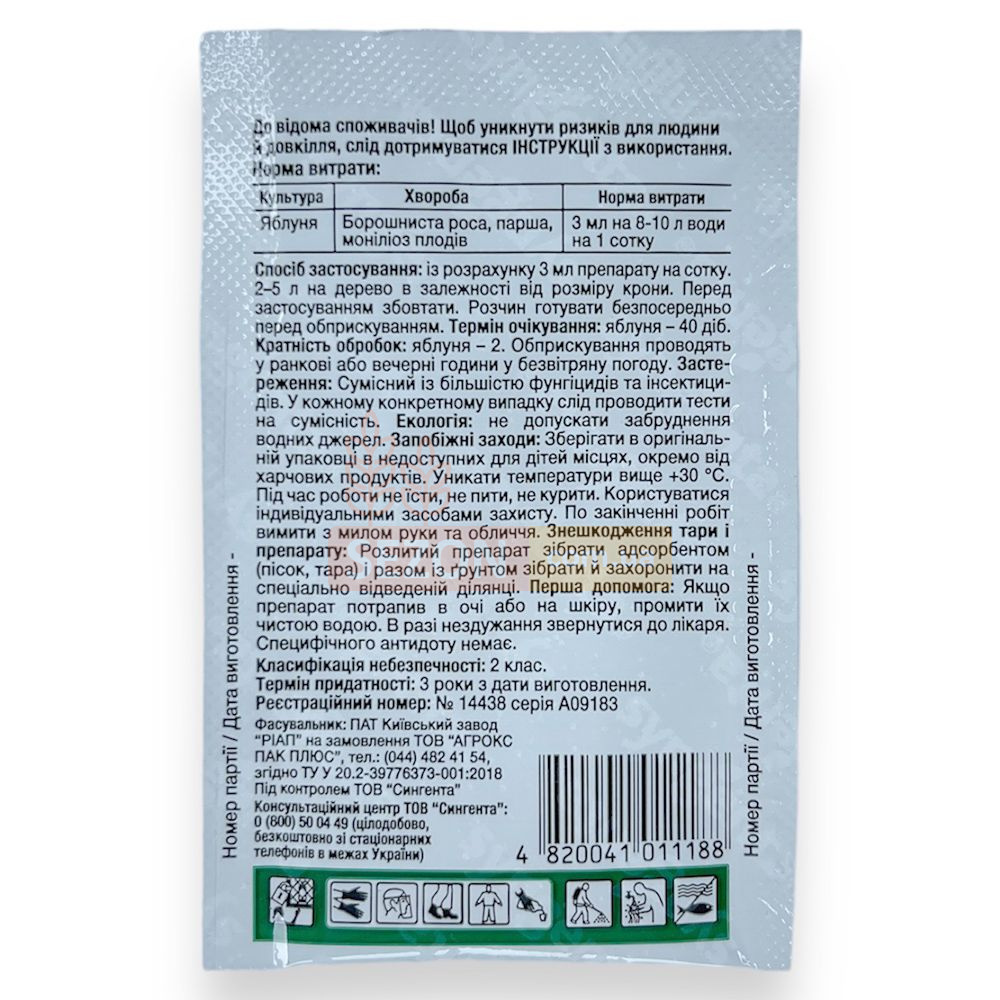 Яблоня | Мучнистая роса, парша, монилиоз плодов | 2.5-3 мл/10 л воды | 2-5 л раствора на 1 дерево | Опрыскивание в период вегетации | 2 / 40 |