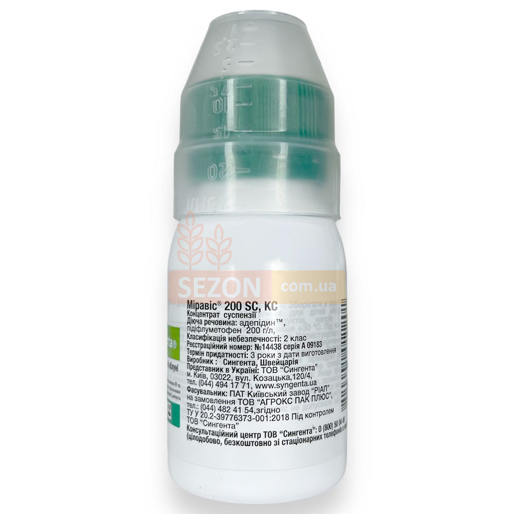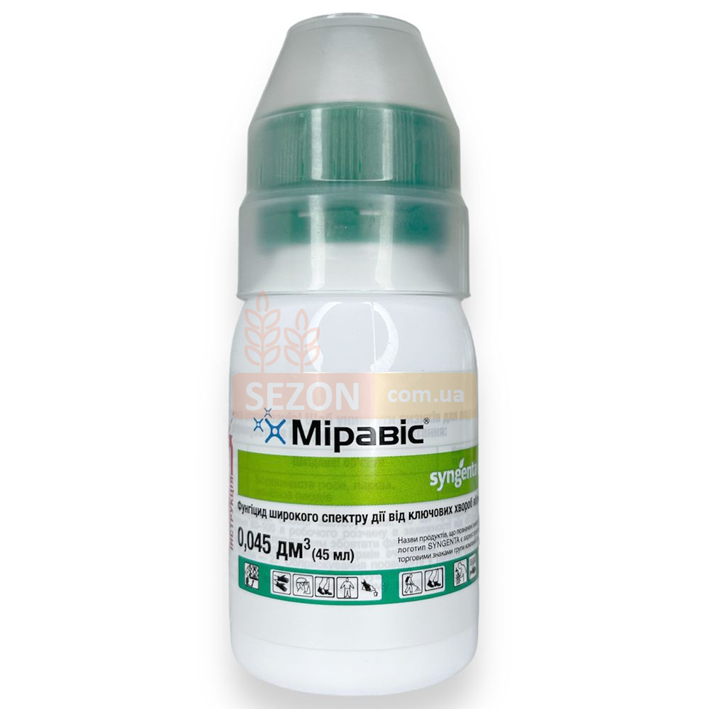 Миравис 200 SC – это контактно-системный фунгицид, предназначенный для защиты яблонь, черешни, персиков, картофеля, томатов, огурцов, капусты, моркови и других культур от комплекса грибковых заболеваний. Препарат эффективно защищает растения от таких заболеваний как парша, мучнистая роса, монилиоз, альтернариоз и других.