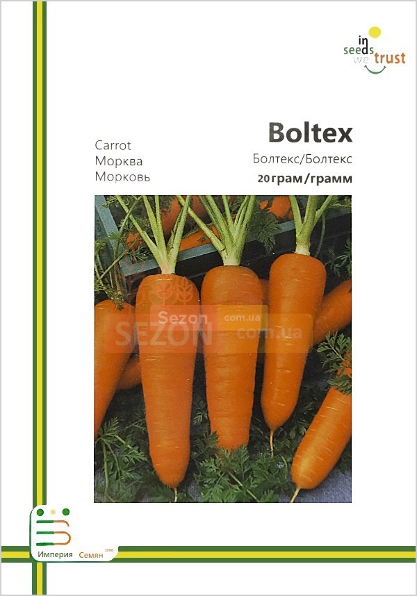 Среднеспелый сорт. Хорошо удается на любых почвах, включая тяжелые черноземы. Районирован во всех регионах Украины и Молдовы. Отличается высокой урожайностью и отличными вкусовыми качествами. Ботва мощная персистентна к неблагоприятной смене погодных условий. Культура устойчива к цветушности и стрелкованию. Формирует выровненные корнеплоды усечено-конической формы. Цвет – насыщенно оранжевый. Мякоть плотная, сладкая, с характерным вкусом и ароматом. Характеризуется повышенным содержанием каротина. «Болтекс» популярен среди огородников-любителей и профессионалов. Имеет универсальное применение: свежее потребление, переработка, при длительном хранении не теряет товарный вид и вкусовые характеристики.