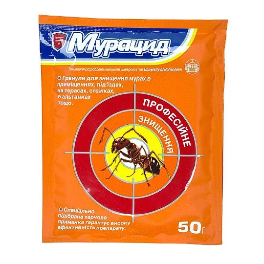 Мурацид от муравьев гранула 50 г Гранулы от муравьев Мурацид Инсектицидные гранулы, применяется в местах скопления и обитания муравьев как на открытых участках, так и внутри помещений. Специально разработанный состав приманивает муравьев, после поедания гранул насекомые гибнут не сразу успевая заразить всю колонию. Данное средство является безопасным для окружающей среды и не накапливается в почве.