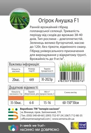 Раннеспелый гибрид, опыляемый пчелами. Тип цветения – женский. Завязь плодов формируется пучковым образом. Культура выращивается на открытой, слегка тенистой грядке. Зрелый огурец имеет форму цилиндра с ребристой среднебугорчатой поверхностью. На ярко-зеленой окраске прослеживаются небольшие полоски и слабовыраженные пятна. Плод вырастает длинной 12 см, а в диаметре достигает до 3,5 см. Вес отдельного огурца в среднем составляет 100 г. Гибрид Анушка устойчив к избыточной влаге и плодоносит постепенно на протяжении всего лета. Огурцы долго сохраняются зелеными, и не имеют горечи. Отлично подходит для консерваций, а также сделает вкусным и полезным любой свежий салат.