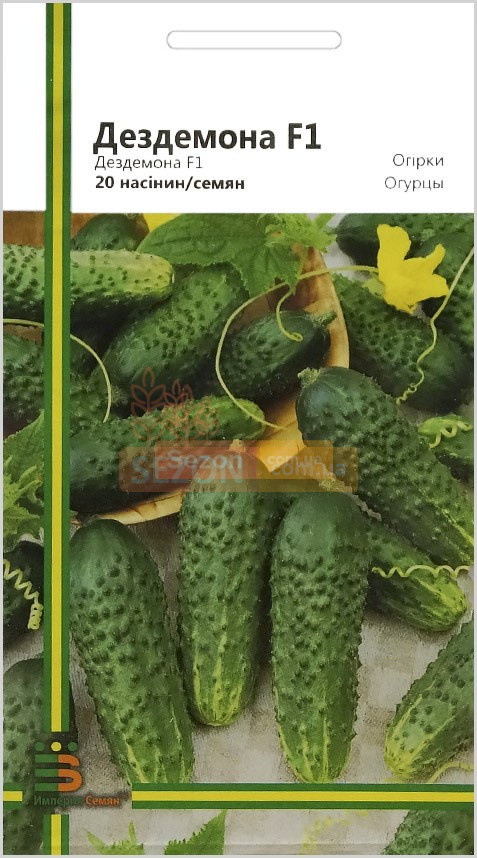 Дездемона F1 - пчелоопыляемый гибрид с вегетационным периодом 50-55 дней. Формирует мощный куст с боковыми побегами средней длины, завязь одиночная. Лучшее время для высева семян май месяц, когда земля достаточно прогреется и минует угроза заморозков. Урожайность стабильная, 6-10 кг/кв.м. Культура болезнестойкая, может выращиваться в открытом грунте и под пленочными укрытиями. Плоды короткие 8-9 см, массой от 60 до 110 г, имеют форму веретена с мелкобугорчатой опушенной поверхностью, зеленого цвета. Вкусовые и товарные качества высокие. Мякоть сочная, не горчит. Зеленцы универсальны в применении - используются свежими, а также в переработанном виде - для соления, маринования консервации.