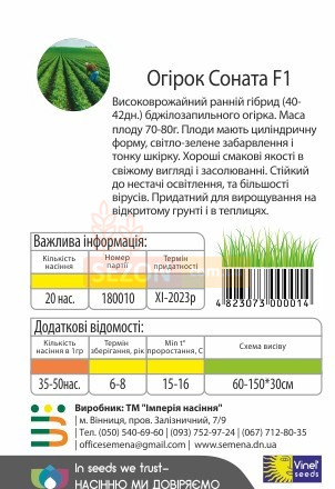 Характеристики Огурец Соната F1 20 семян пчелоопыляемый ранний, Vinel' Seeds