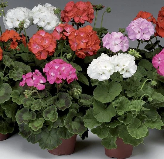 Пеларгония садовая Пинто F1 (Pelargonium hortorum Pinto Premium F1). Мощная и хорошо ветвящаяся серия, которая отлично подходит для выращивания в горшках и кассетах диаметром 11-13 см в условиях высокой плотности культуры. Крупные соцветия находятся на коротких цветоносах, что значительно облегчает транспортировку растений. Благодаря повышенной однородности и раннему, обильному цветению серию можно отнести к премиум классу. Высота 30-35 см. Время выращивания после высадки в горшки 10-12 недель.