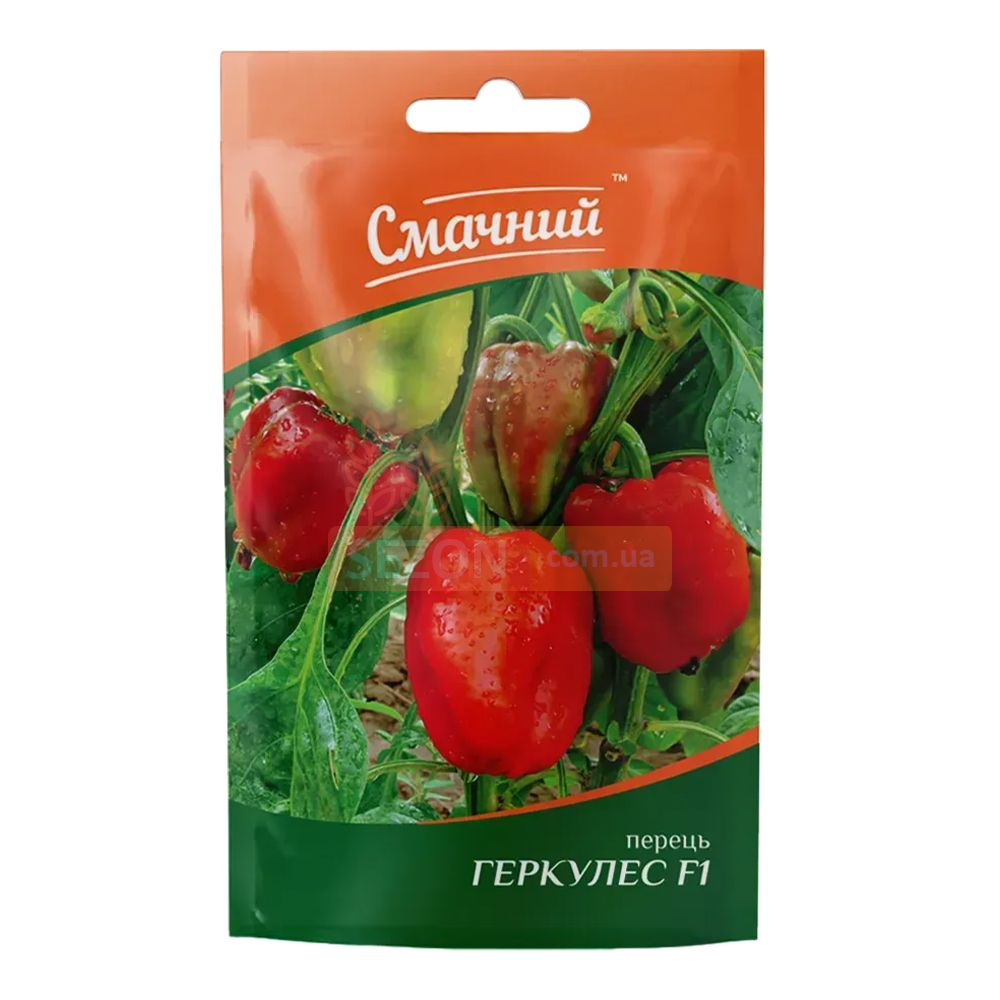 Перцы сорта «Геркулес» имеют кубовидную форму, плотную мясистую структуру и насыщенный красный цвет в стадии полной зрелости. В технической зрелости они зелёные, что также удобно для постепенного сбора урожая. Вес одного плода — от 250 до 300 граммов, а стенки достигают толщины 7–10 мм, благодаря чему он идеально подходит как для употребления в свежем виде, так и для термической обработки.