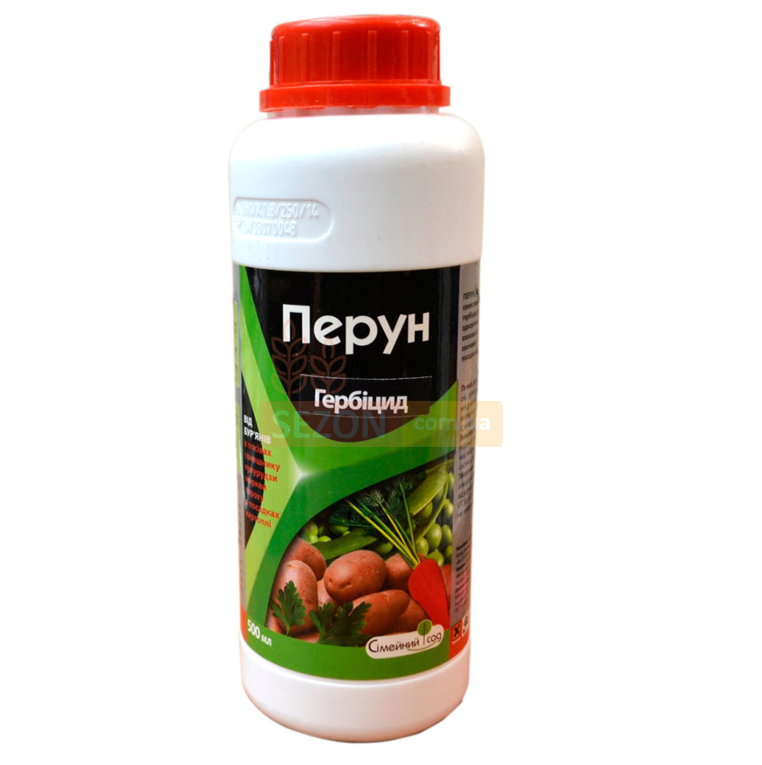 «Перун» — системное гербицидное средство избирательного действия. Поражает однолетние двудольные и злаковые сорняки. Используется на посевах сои, кукурузы, подсолнечника, моркови, гороха, посадках картофеля. К препарату «Перун» чувствительны горчак, звездчатка, дурман, мятлик, осот, паслен, росянка, крапива, просо, пальчатка и др. Активное вещество — прометрин. Он проникает в растение через надземные органы, распространяясь по сосудам, блокирует процесс фотосинтеза, который является жизненно важным для растения. Уже проросшие сорняки отмирают в течение 5-7 дней, а молодые погибают при прорастании.