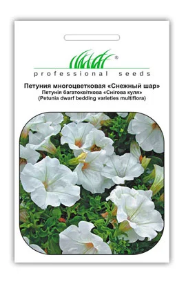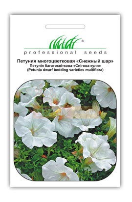 Петуния карликовая Снежный шар - однолетние растение достигает 30 см в высоту. Очень обильно и длительно цветет. Бутоны белой окраски 5-6 см в диаметре. Растение устойчиво к жаре, дождю и ветру. Рекомендуется выращивать как на клумбах, так и для посадки в горшках.
