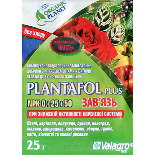 Плантафол + NPK 0-25-50 — комплексное удобрение, полностью растворимое в воде. Применяется в качестве листовой подкормки растений для стимуляции образования завязей и предотвращения их осыпания. Является эффективным дополнением к основному питанию, вносимому под корень. В составе удобрения присутствует азот в амидной форме, который действует как увлажнитель и улучшает поглощение растением необходимых элементов питания через листовую поверхность. Препарат содержит прилипатель, благодаря чему удобрение обладает устойчивостью к смыву водой. Не содержит натрия, хлора и других вредных примесей, не оставляет солевого налета на листьях. Состав: азот, фосфор, калий, бор, медь, цинк, марганец, железо, молибден.