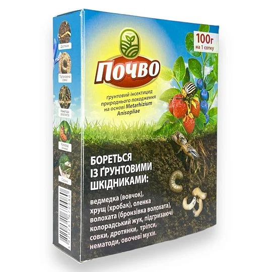 Биопрепарат "ПОЧВО" предназначен для борьбы с почвенными вредителями: колорадские жуки, личинки и имаго (майского майского жука, червя), медведок (капустянок, волчков), кузнецов, проволочников, саранча, кузнечиков, трипсов, корневых длинноносиков, , совки, клопы, термиты, муравьи, нематоды (золотая, картофельная и др.).